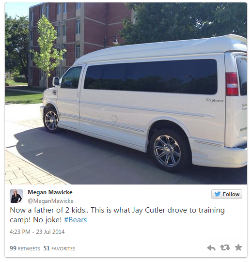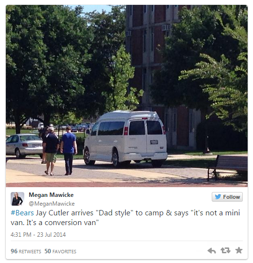 Jay Cutler showed up to Bears training camp today driving the vehicle you see above, what Jay calls a conversion van. Cutler made it very clear that this was not a mini-van, probably because he has spawned a whole brood of mini-Cutlers and a mini-van seems like a pretty sensible option for a dad. But it’s a conversion van, not a dad-van.